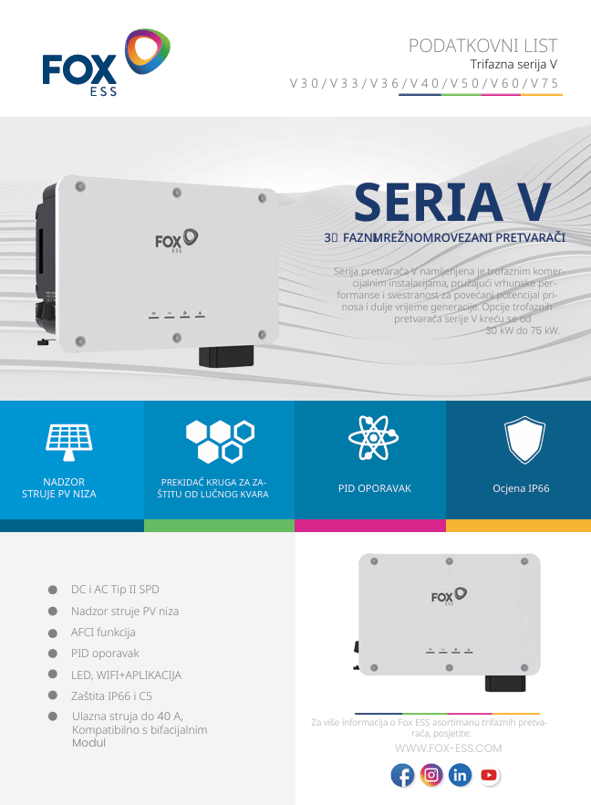 Serija pretvarača V namijenjena je trofaznim komercijalnim instalacijama, pružajući vrhunske performanse i svestranost za povećani potencijal prinosa i dulje vrijeme generacije. Opcije trofaznih pretvarača serije V kreću se od 30 kW do 75 kW.